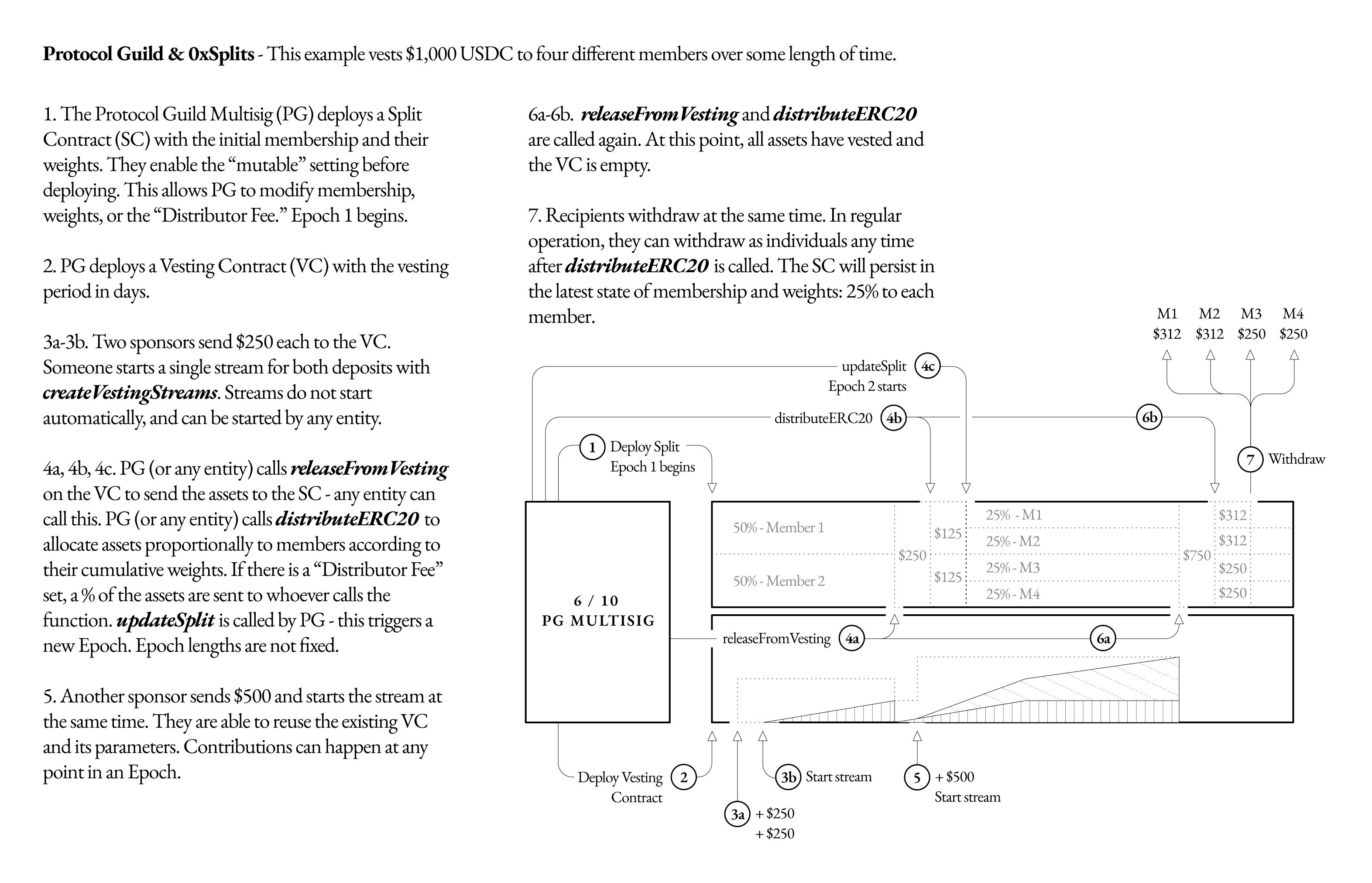 At this point, we're ready to test the mechanism's efficacy with a 1 year / $10-20mm Pilot. We want to make sure the mechanism operates smoothly before graduating to a full-scale fundraising round for longer vesting periods. The funds for the Pilot would be vested directly to Guild members over one year: see the Pilot vesting contract here.